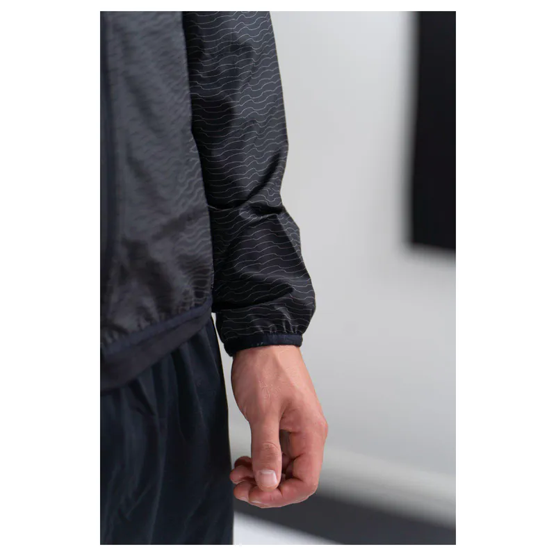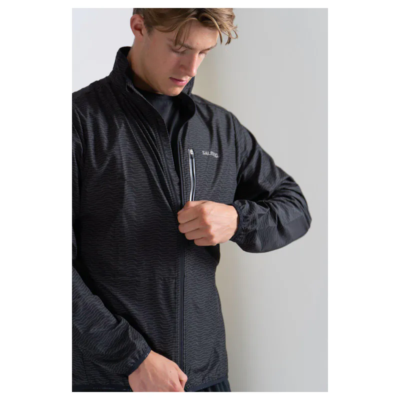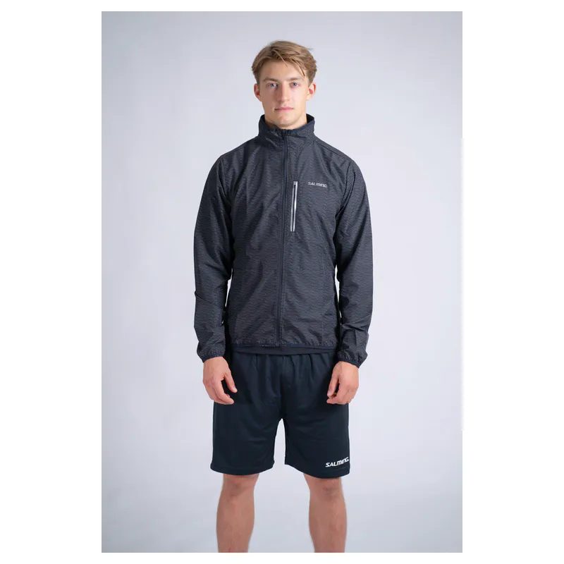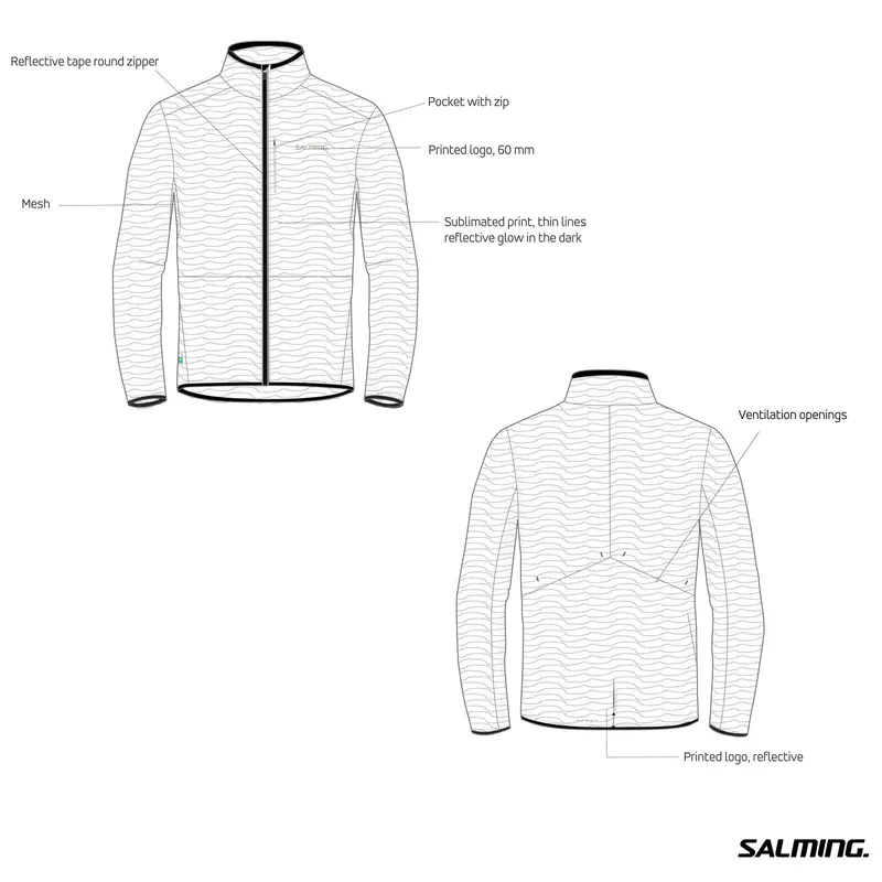 Reverse YKK zipper to prevent water from entering. Reflective Salming logotype at chest and back. Chest pocket with reflective details. Elastic binding at sleeve, throat, and hem.